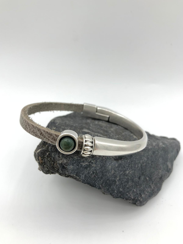 Deze mooie armband is gemaakt van Natuursteen Agaat. Bovendien is het materiaal nikkelvrij en zwaar verzilverd. De kleur is leer Taupe en heeft een magneetafsluiting van 5 mm.