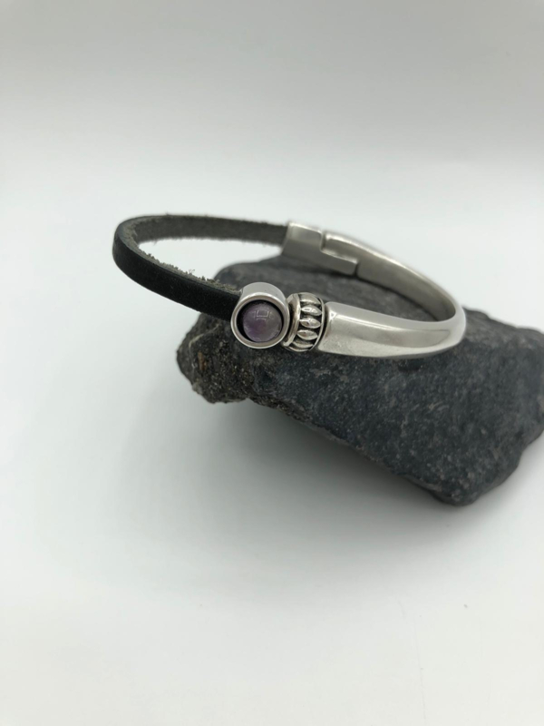 Deze mooie armband is gemaakt van Natuursteen Amethist. Bovendien is het materiaal nikkelvrij en zwaar verzilverd. De kleur is leer Zwart en heeft een magneetafsluiting van 5 mm.