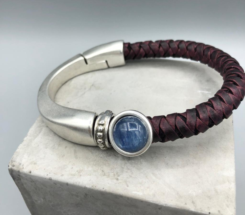 Deze mooie armband is gemaakt van Natuursteen Kyaniet. Bovendien is het materiaal nikkelvrij en zwaar verzilverd. De kleur leer is Bordaux gevlochten en heeft een magneetafsluiting van 10 mm.