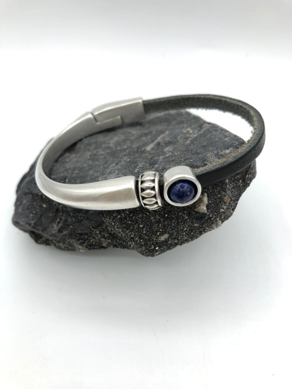 Deze mooie armband is gemaakt van Natuursteen Lapis Lazulli. Bovendien is het materiaal nikkelvrij en zwaar verzilverd. De kleur is leer zwart en heeft een magneetafsluiting van 5 mm. Let op: