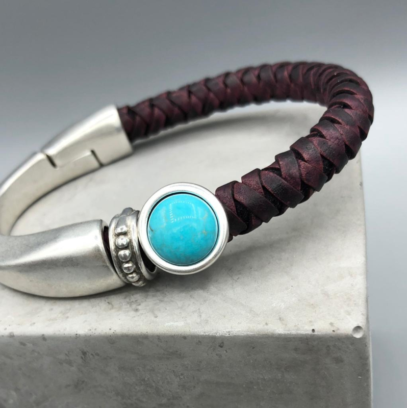 Deze mooie armband is gemaakt van Natuursteen Magnesiet. Bovendien is het materiaal nikkelvrij en zwaar verzilverd. De kleur is leer Bordaux gevlochten en heeft een magneetafsluiting van 10 mm.