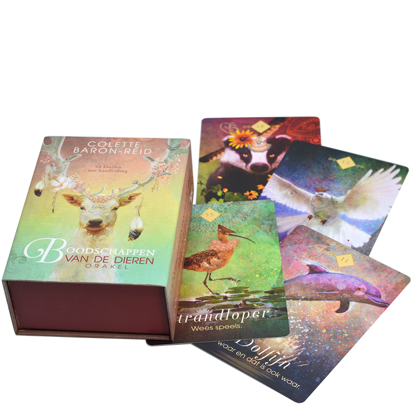 De Boodschappen van de Dieren Orakels is een verzameling intuïtieve wijsheid en spirituele begeleiding die kracht ontleent aan het dierenrijk. Elk van de 68 kaarten in dit prachtig geïllustreerde deck vertegenwoordigt de hogere zielskracht van een uniek dier, insect, vis of vogel. Ze dragen allemaal hun eigen archetypische symboliek en betekenis, met een onderliggende boodschap van diepe en tijdloze waarheid. Met de hulp van intuïtieve grootmeester en orakelexpert Colette Baron-Reid kun je nu je verbinding met Spirit herstellen en versterken. Samen zullen we een nieuwe werkelijkheid creëren om al het leven op aarde te dienen.