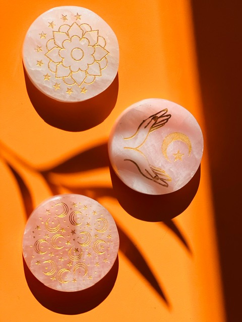 Gegraveerde rozenkwarts schijf met een maansikkel en sterren patroon, om bijvoorbeeld op een altaar te plaatsen of bij je te dragen als talisman.