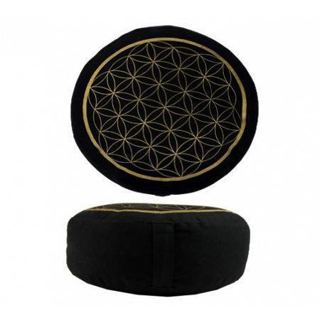 Meditatiekussen – zwart met gouden levensbloem – fijnmazig netwerk in opdruk