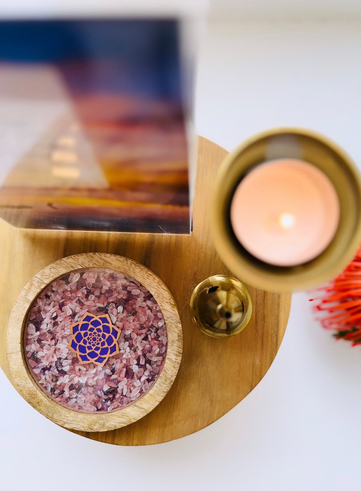 De onderzetter met een mangohouten buitenrand is gevuld met halfedelstenen en een rond esoterisch symbool van geleidend koper. Hierdoor wordt de energie van de edelstenen versterkt, net zoals bij orgoniet. Gegoten in polyesterhars.