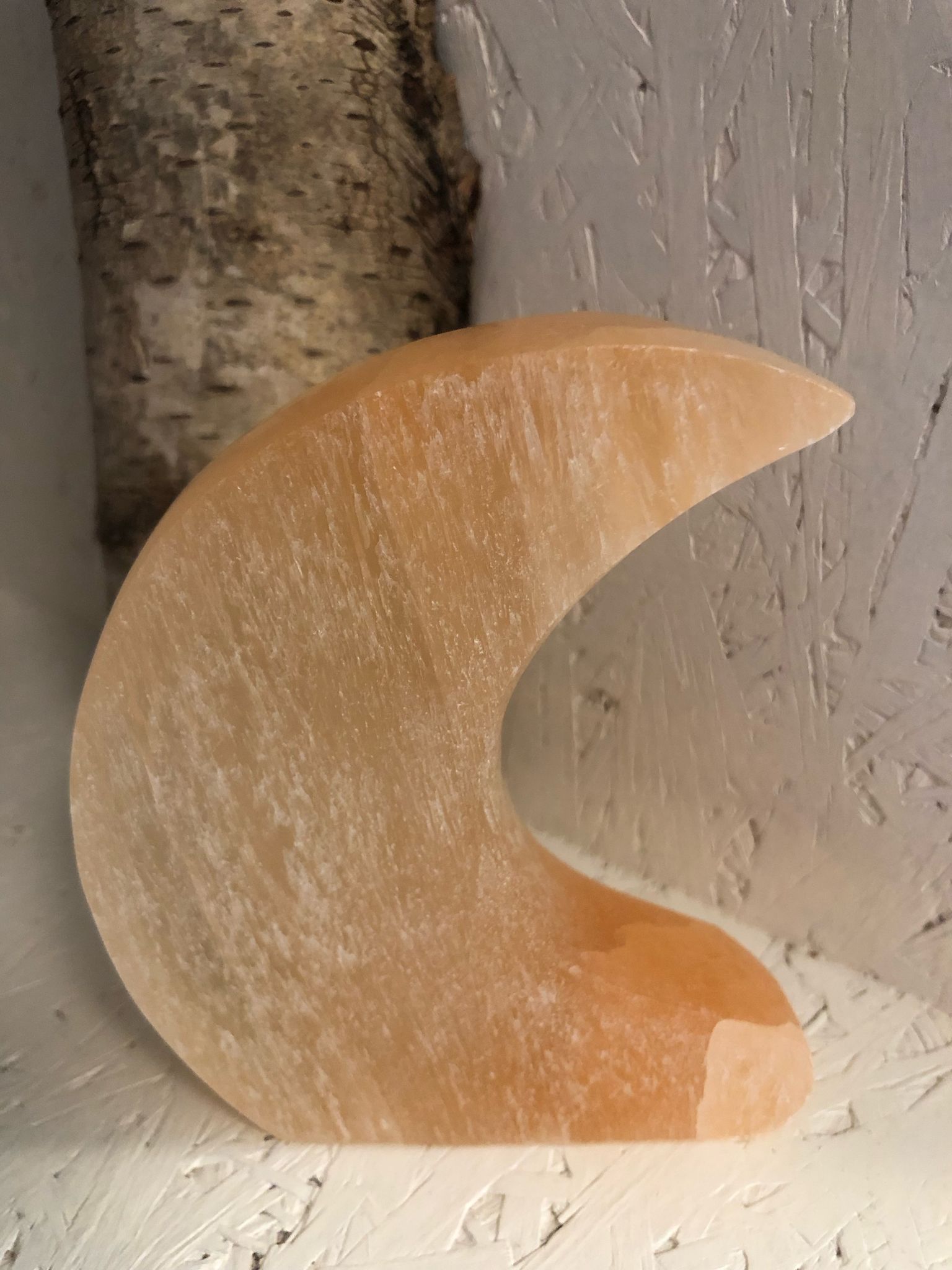 Een staande maan van seleniet, een stijlvol en decoratief stuk voor elk interieur..