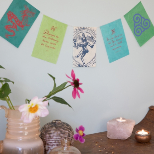 Deze wenskaart in de vorm van vlaggetjes is geïnspireerd op de vlaggetjes zoals die worden opgehangen op de bergpassen in Tibet en Nepal. Die wapperen daar in de wind om voorspoed te verspreiden. De wensvlaggetjes zijn in Nepal fair trade gemaakt van handgeschept papier. Bij de slinger met 5 vlaggetjes van 10×15 cm zit een los vel voor een persoonlijke boodschap en een envelop in bijpassende kleur. Verpakt met een omslag waarop alle informatie te lezen is. Op de vlaggetjes staan afbeeldingen van een Chinese draak (beschermende kracht) een dansende Shiva (Hindoe god, scheppende kracht) en een triskelion (symbool van onverzettelijkheid) en de spreuken ‘Wie zijn bestemming kent, vindt de weg’ (Lao Tze)en ‘Waar de vrees voor de tijger heerst, is het altijd nacht’ (Indiase spreuk).