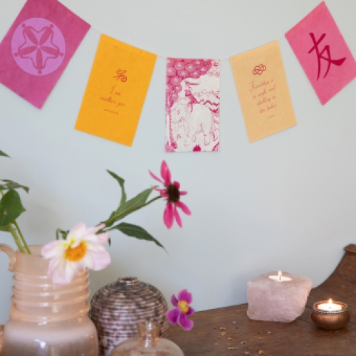 Deze wenskaart in de vorm van vlaggetjes is geïnspireerd op de vlaggetjes zoals die worden opgehangen op de bergpassen in Tibet en Nepal. Die wapperen daar in de wind om voorspoed te verspreiden. De wensvlaggetjes zijn in Nepal fair trade gemaakt van handgeschept papier. Bij de slinger met 5 vlaggetjes van 10×15 cm zit een los vel voor een persoonlijke boodschap en een envelop in bijpassende kleur. Verpakt met een omslag waarop alle informatie te lezen is. Op de vlaggetjes staan afbeeldingen van een vriendschapscirkel, de vier harmonieuze vrienden (Tibet) en het karakter voor vriendschap en de spreuken ‘Ik ben een andere jij’ (Maya spreuk) en ‘Vriendschap is één ziel in twee lichamen’ (Aristoteles).