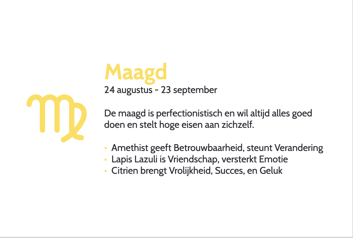 Zakje met stenen passend bij sterrenbeeld Maagd (24 augustus – 23 september). De maagd is perfectionistisch en wil altijd alles goed