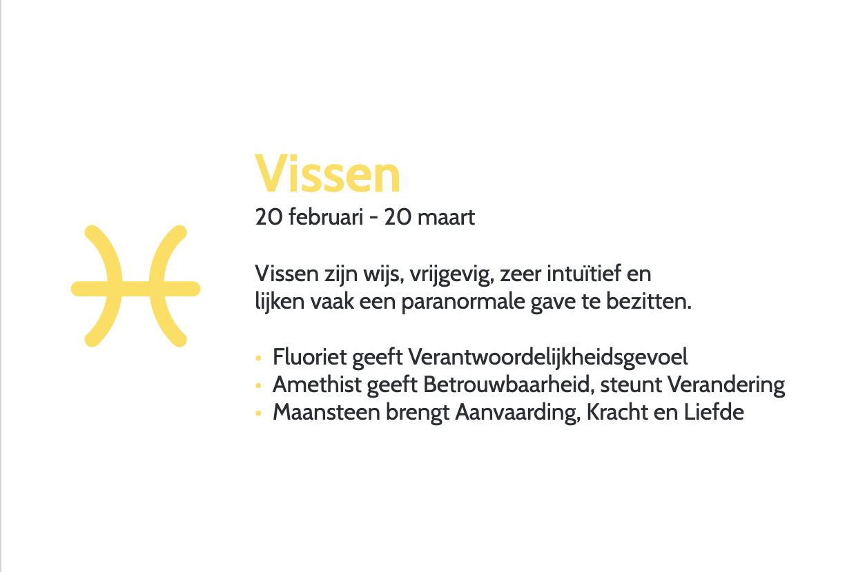 Zakje met stenen passend bij sterrenbeeld Vissen (20 februari – 20 maart). Vissen zijn wijs, vrijgevig, zeer intuïtief en